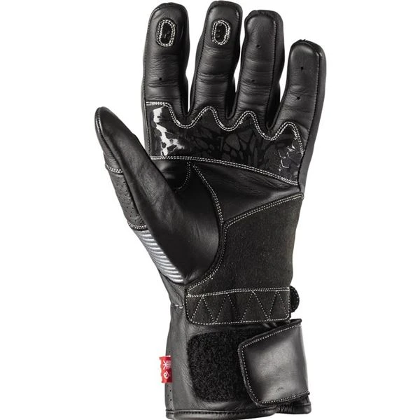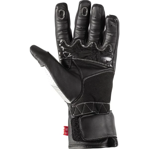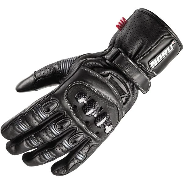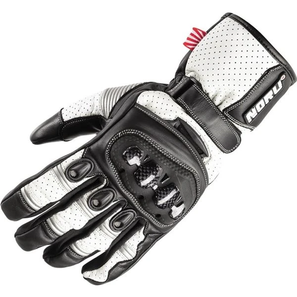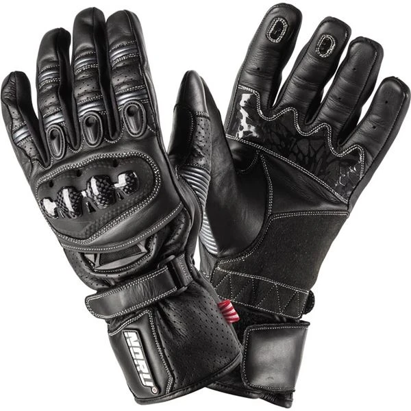 Racer style gauntlet gloves with street friendly features at a modest cost. These sport style cowhide gloves feature double layer palm sections and real carbon fiber knuckles for excellent protection. A comfortable and secure fit is provided by pre-curved fingers, concertina stretch panels, and a wrist retention strap, while conductive thread in index fingertips and tumbs allows touchscreen use.